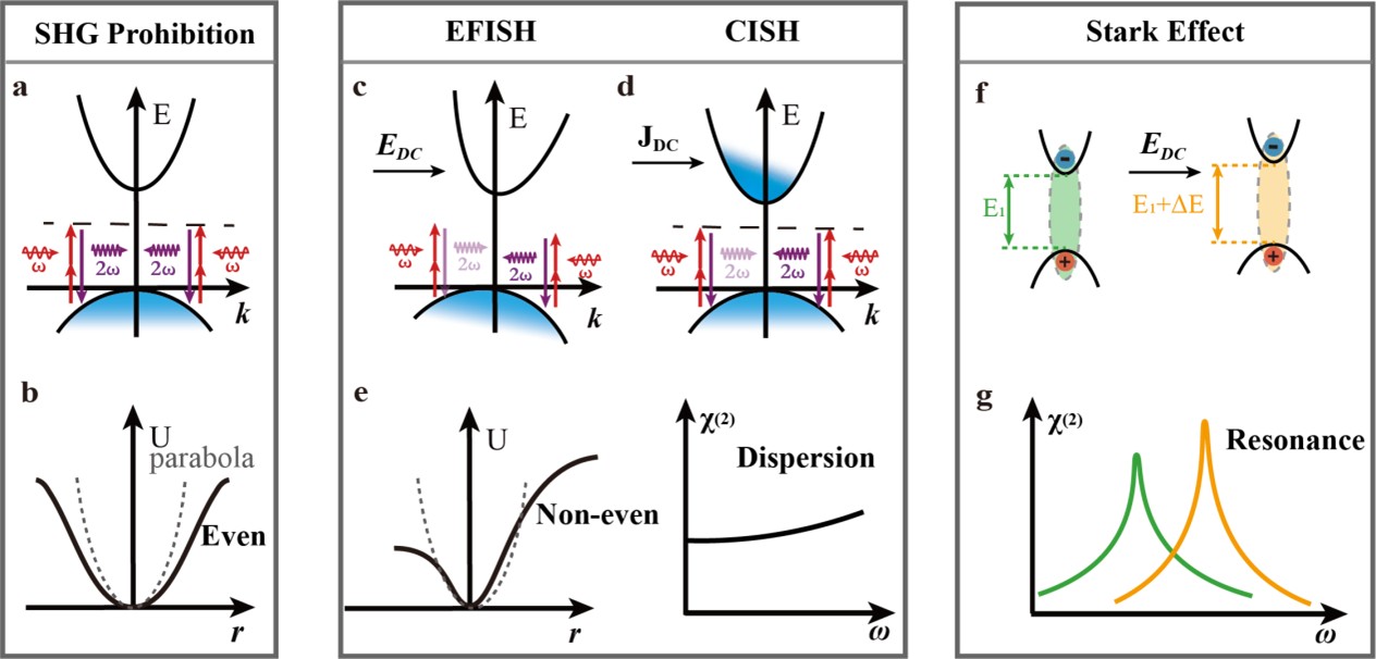 In this context, the Electric-Field-Induced Second-Harmonic Generation (EFISH) effect has garnered renewed and widespread attention within the academic community as an ingenious "symmetry-breaking" strategy. The essence of EFISH lies in the application of a static electric field (DC field) to the material, which induces a distortion in the originally symmetric electronic potential, thereby breaking the material's spatial inversion symmetry. This external-field-induced symmetry breaking generates an effective second-order nonlinear susceptibility "χ" _"eff" ^"(2)" "=" "χ" ^"(3)" "E" _"DC" , where "χ" ^"(3)" representing the material's intrinsic third-order nonlinear susceptibility. This mechanism not only enables the realization of SHG in centrosymmetric materials like silicon but, more importantly, introduces a tunable degree of freedom: the electric field. By altering the applied voltage or utilizing optical rectification fields, the intensity, phase, and even the polarization state of the nonlinear signal can be dynamically modulated. This characteristic provides a novel physical foundation for the realization of electrically controlled nonlinear metasurfaces, reconfigurable photonic chips, and emerging carrier dynamics probing techniques, serving as a core driving force for the development of next-generation intelligent, tunable nonlinear photonic devices.