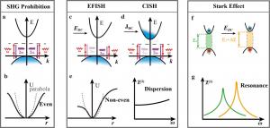 Fig. 1: Schematic overview of the key topics covered in this review. The EFISH effect emerges from the intimate coupling between electronic dynamics and nonlinear photonic. Depending on the EFISH functionality, the research can be categorized in to three
